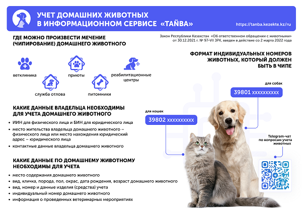 Подробную и дополнительную информацию о постановке домашних животных на учет можно найти на сайте tanba.kezekte.kz